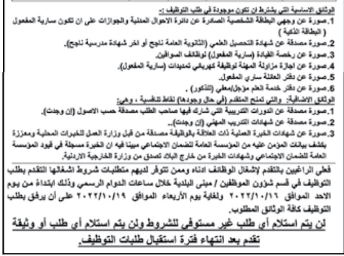 وأوضح الإعلان أن على الراغبين بالتقدم للوظائف تقديم طلب التوظيف لدى قسم شؤون الموظفين في البلدية، اعتباراً من يوم الاحد 16/10/2022 إلى يوم الأربعاء 19/10/2022.