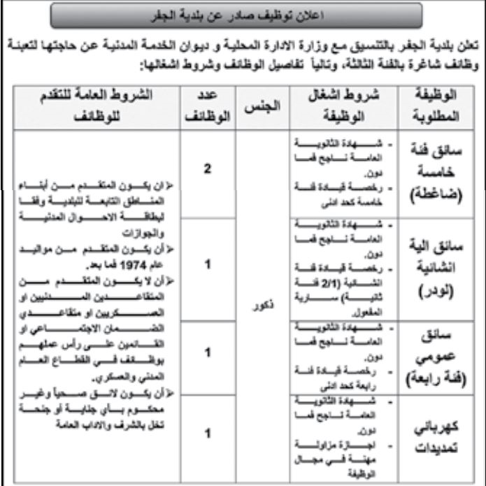 وبين إعلان البلدية أن الوظائف المطلوبة هي ( سائق فئة خامسة، سائق آلية انشائية، سائق عمومي، كهربائي تمديدات).