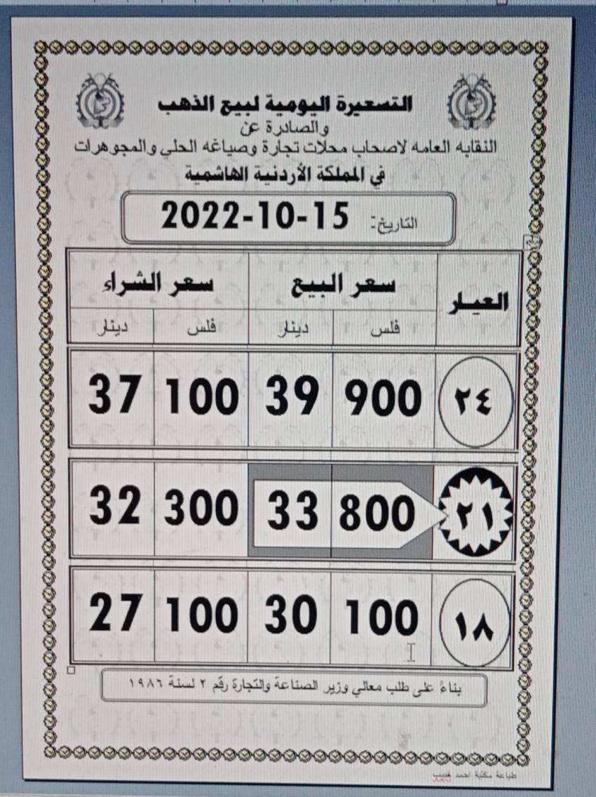 وبلغ سعر غرام الذهب عيار 21 عند 33.80 دينارا، لجهة الشراء من المحلات مقابل 32.30 دينارا لجهة البيع.