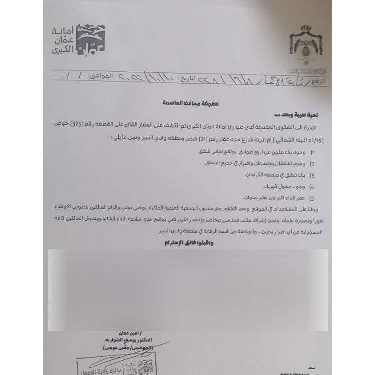 وذكر مسؤول في الأمانة أن كوادرها المختصة سارعت للكشف الحسّي على عقارين في تلاع وأم أذينة فور تلّقيها شكاوى من قاطني المبنيين، اللذين يؤيان قرابة 100 شخص.