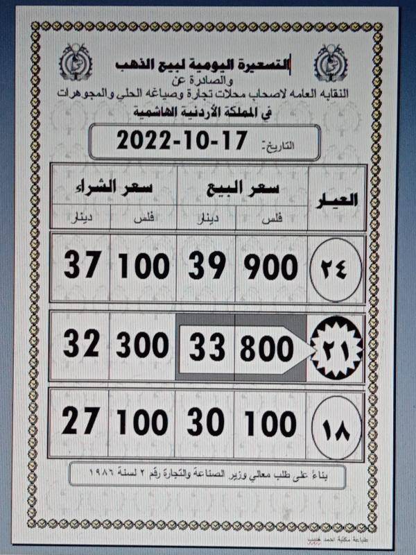 وبحسب التسعيرة بلغ سعر غرام الذهب عيار 21 عند 33.80 دينارا، لجهة الشراء من المحلات مقابل 32.30 دينارا لجهة البيع.