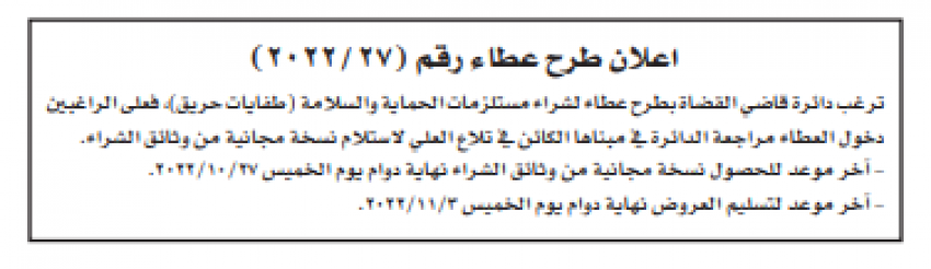 مطلوب توريد طفايات حريق لدائرة قاضي القضاة