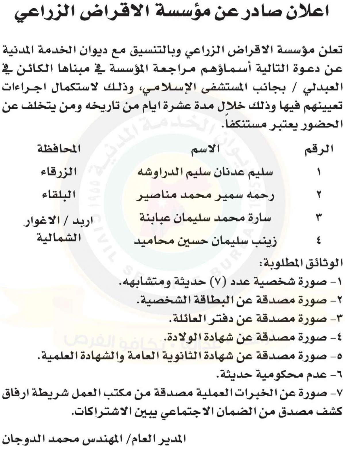 نيروز الإخبارية : أعلنت مؤسسة الإقراض الزراعي وبالتنسيق مع ديوان الخدمة المدنية عن دعوة التالي أسماؤهم لمراجعة المؤسسة لاستكمال إجراءات التعيين.