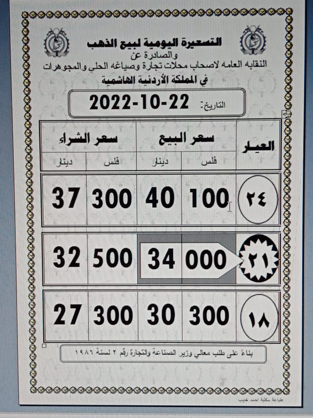 وبلغ سعر غرام الذهب عيار 21 عند 34،00 دينارا، لجهة الشراء من المحلات مقابل 32،50 دينارا لجهة البيع.