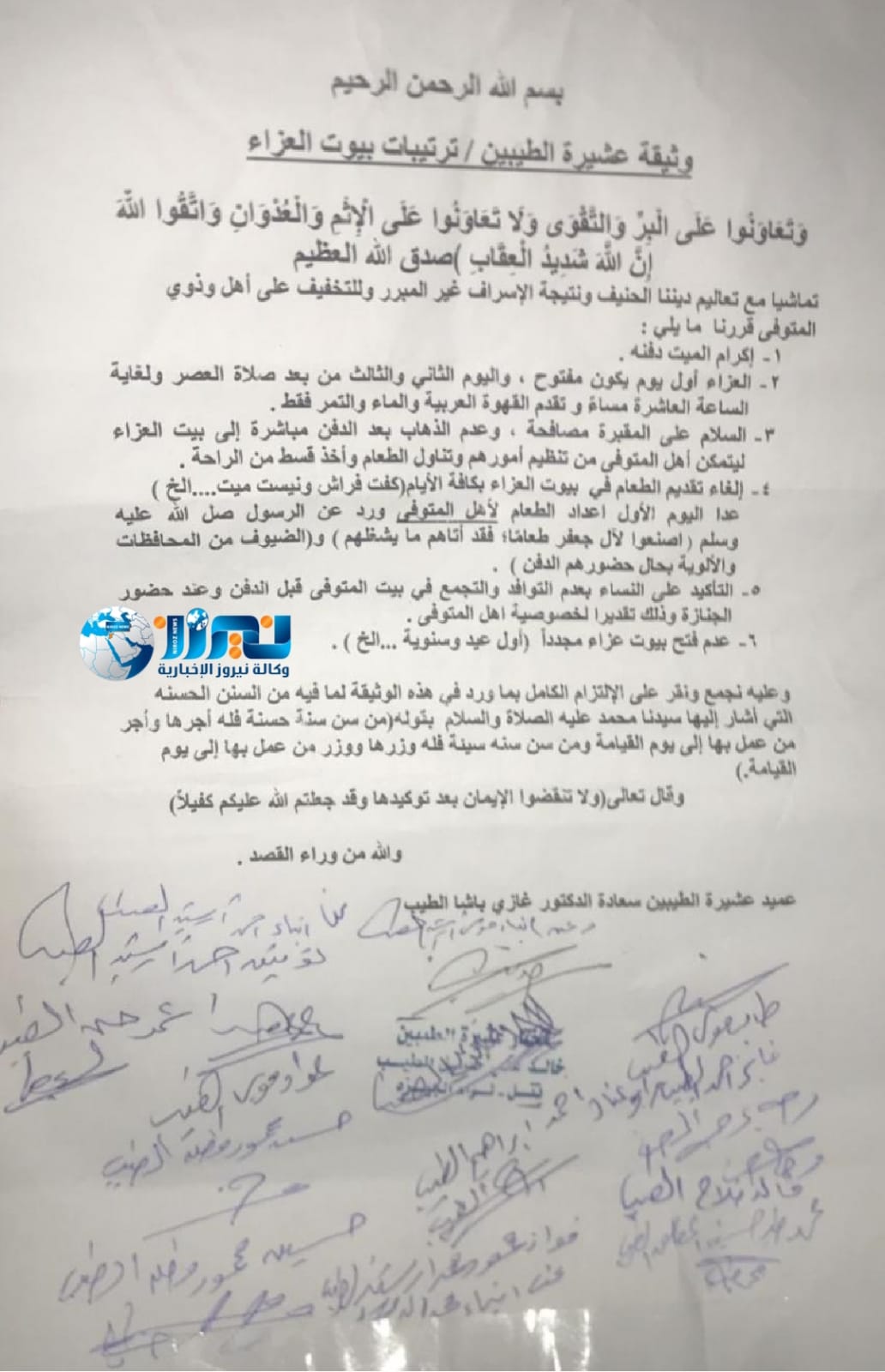 ونصت الوثيقة على أن يكون يوم العزاء الأول مفتوحا، فيما يبدأ العزاء في اليومين الثاني والثالث بعد صلاة العصر ولغاية الساعة العاشرة مساء، على أن يقدم القهوة العربية والماء والتمر فقط.