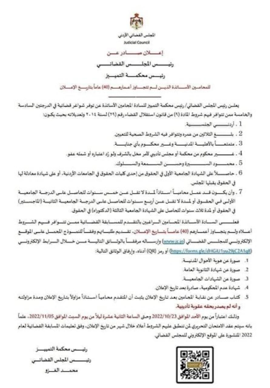 أعلن رئيس المجلس القضائي / رئيس محكمة التمييز عن توفر شواغر قضائية في الدرجتين السادسة والخامسة للمحامين الاردنيين الأساتذة الذين لم تتجاوز أعمارهم (40) عاما ممن تتوفر فيهم شروط المادة (9) من قانون استقلال القضاء رقم (29) لسنة 2014 وتعديلاته.
