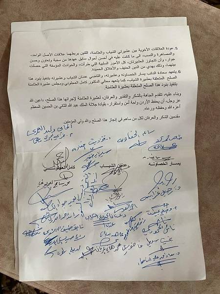 وقعت عائلتي الشياب والعثامنة اليوم السبت صك صلح عشائري على خلفية مقتل الملازم أحمد محمد سليم العمارين "العثامنة" جرى الموافقة خلاله على دفع الدية البالغة مئة ألف دينار أردني من قبل عشيرة الشياب..
