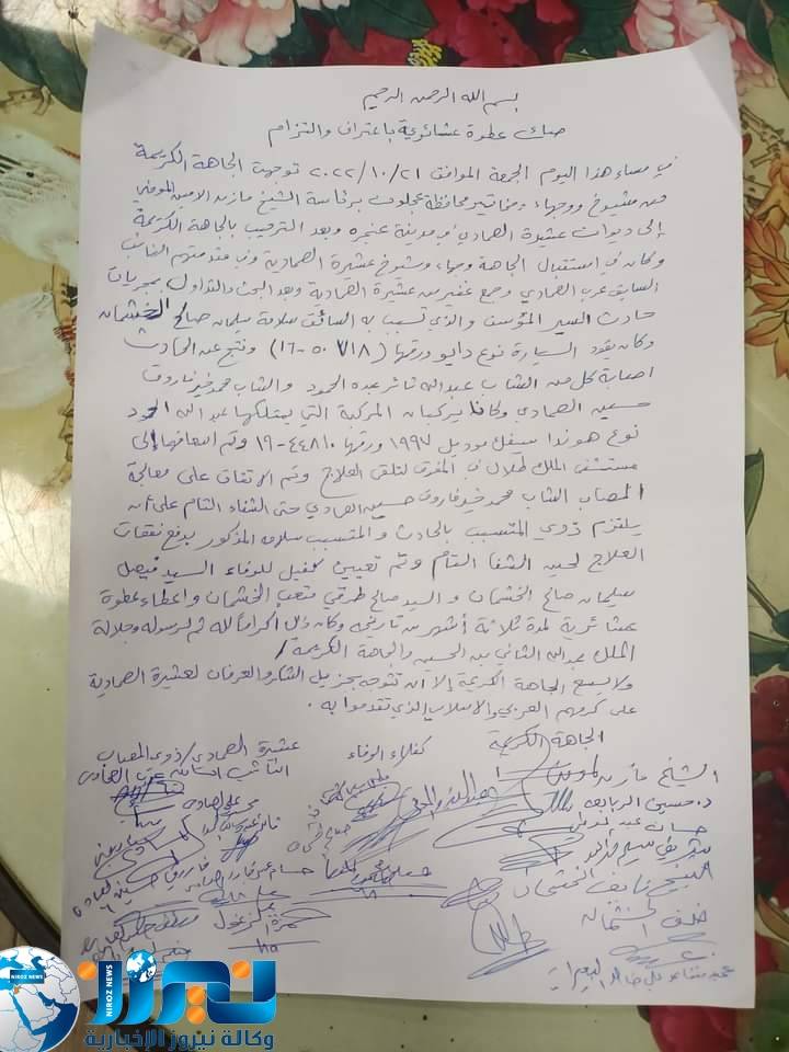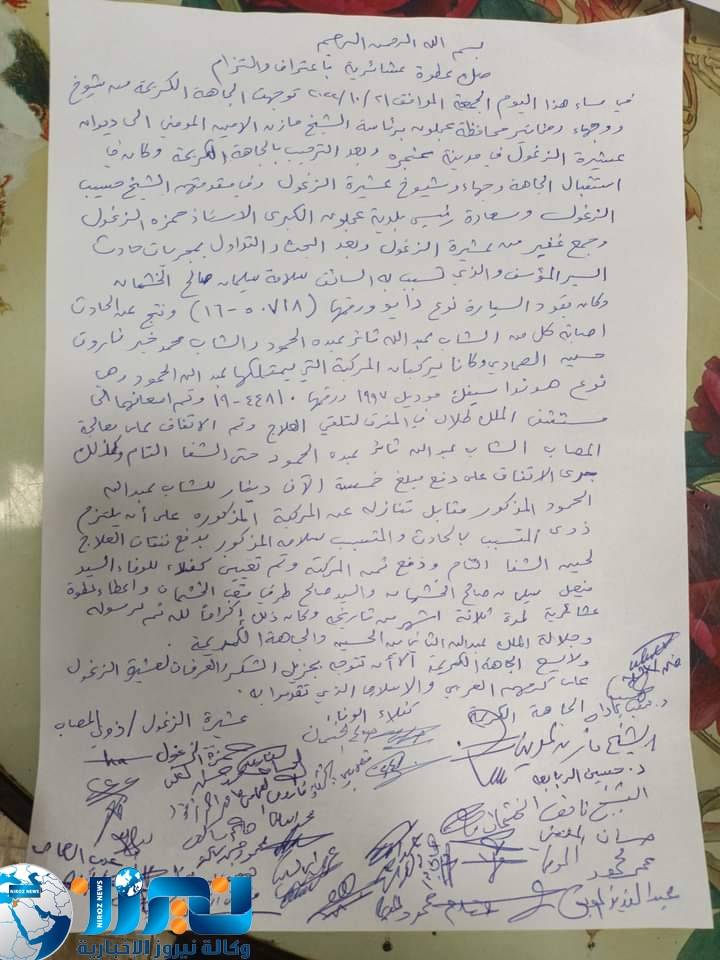 قامت جاهة تضم جمع من وجهاء محافظة عجلون برئاسة سعادة الشيخ مازن الأمين المومني بأخذ عطوة باعتراف والتزام من عشيرتي الصمادية والزغول في مدينة عنجره لصالح عشيرة الخشمان وذلك على إثر حادث السير المؤسف والذي تسبب به السائق سلامه سلمان صالح الخشمان وأصيب فيه كل من الشاب عبدالله ثائر عبده الحمود والشاب محمد خير فاروق حسين الصمادي بإصابات متفرقة وحدوث اضرار بليغة بسيارة الشاب عبدالله الحمود وتم الاتفاق على التزام السائق المتسبب بالحادث وذويه بالتكفل بالعلاج الكامل حتى الشفاء التام للشابين عبدالله الحمود ومحمد الصمادي وكذلك دفع مبلغ خمسة آلاف دينار ثمن السيارة التي يمتلكها الشاب عبدالله الحمود وذلك كون السائق المتسبب بالحادث ليس لديه تأمين على سيارته وكانت مدة العطوة ثلاثة أشهر .