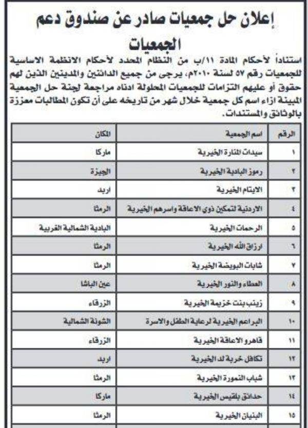 نيروز الإخبارية : أعلن صندوق دعم الجمعيات، في وزارة التنمية الاجتماعية اليوم الأحد، حلّ عدد من الجمعيات في المملكة.