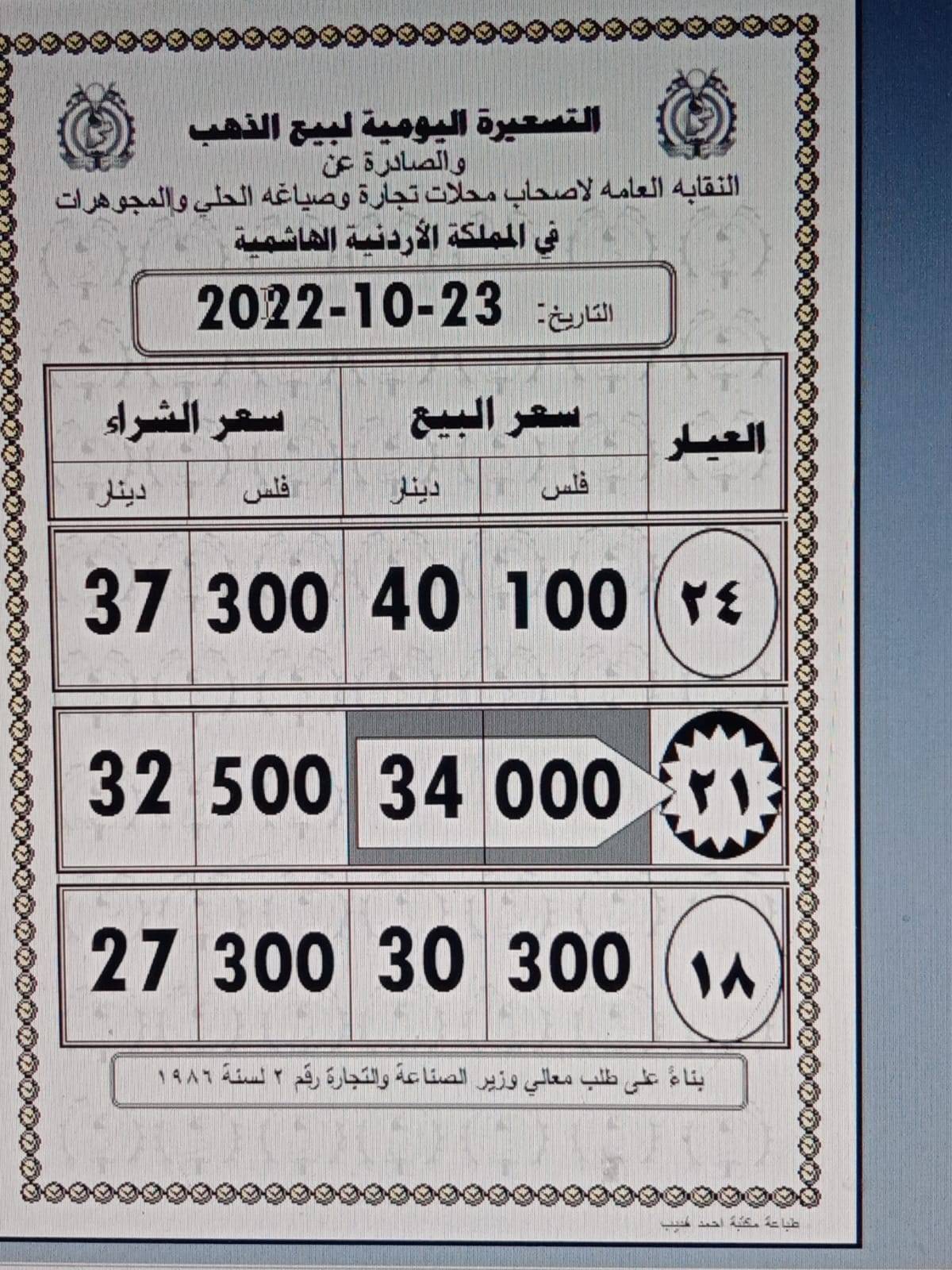 وبلغ سعر غرام الذهب عيار 21 عند 34،00 دينارا، لجهة الشراء من المحلات مقابل 32،50 دينارا لجهة البيع.