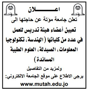 كما أعلنت جامعة مؤتة إلى تعيين عدد من أعضاء الهيئة التدريسية في تخصصات ( الهندسة، تكنولوجيا المعلومات، الصيدلة، العلوم الطبية المساندة) ودعت الراغبين بالتقدم لهذه الوظائف الاطلاع على موقع الجامعة الالكتروني.