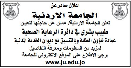ووفقاً للجامعات الثلاثة، أعلنت الجامعة الأردنية عن حاجتها لتعيين طبيب بشري في دائرة الرعاية الصحية، وذلك بالتنسيق مع ديوان الخدمة المدنية، حيث دعت الراغبين بالتقدم لهذه الوظيفة الاطلاع على موقع الجامعة الالكتروني.