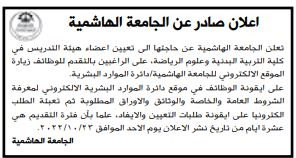 وأعلنت الجامعة الهاشمية عن تعيين أعضاء هيئة تدريس في كليتي التربية البدنية وعلوم الرياضة، حيث دعت الراغبين بالتقدم للوظائف زيارة الموقع الالكتروني للجامعة.
