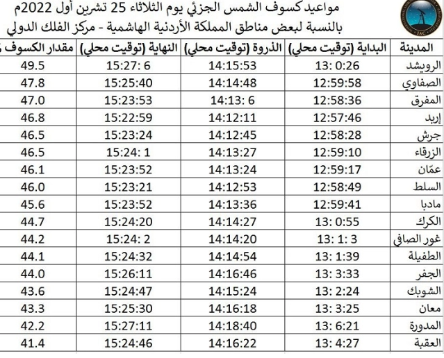 مواعيد الكسوف بحسب المناطق الأردنية