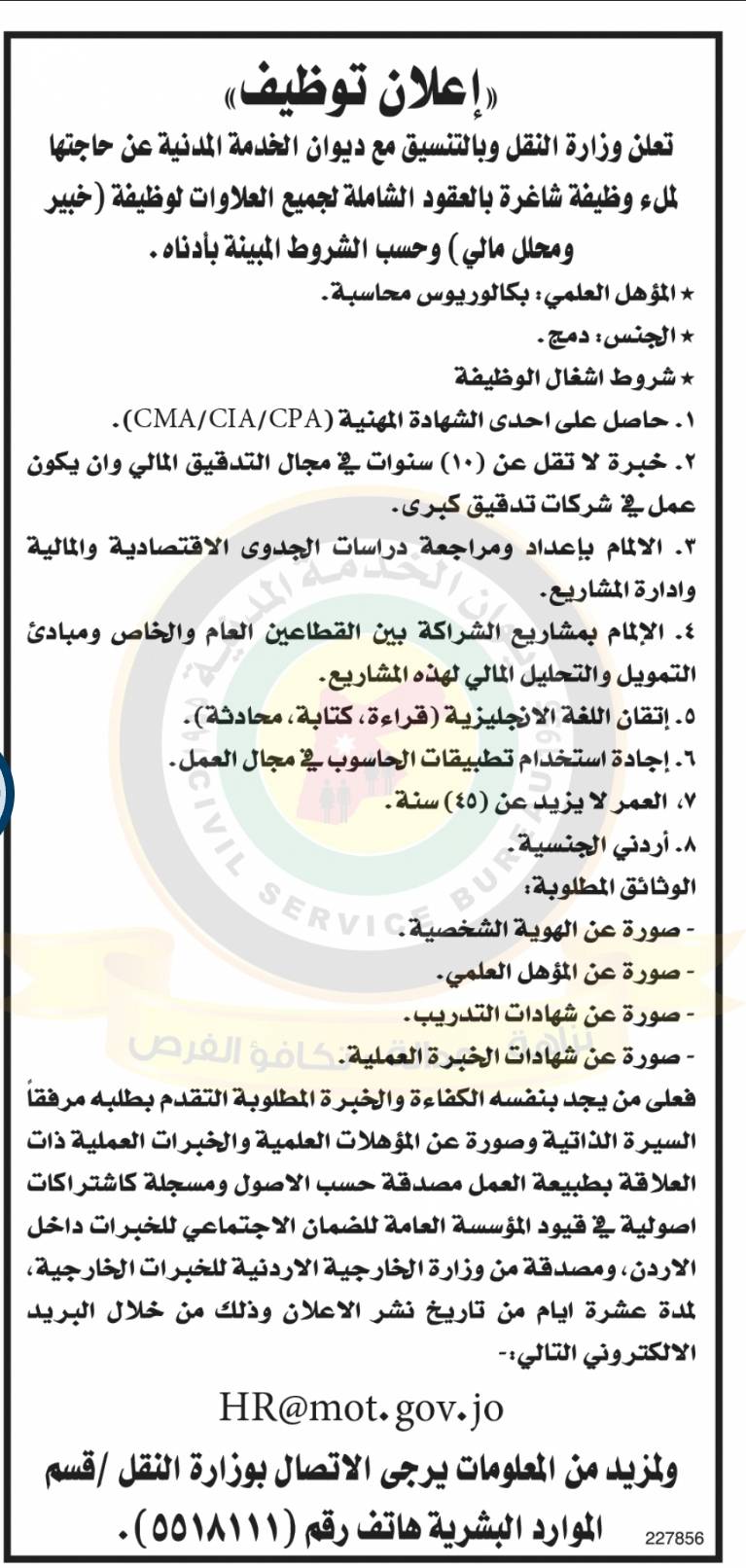 أعلنت وزارة النقل وبالتنسيق مع ديوان الخدمة المدنية عن حاجتها لملء وظيفة شاغرة بالعقود الشاملة لجميع العلاوات لوظيفة خبير ومحلل مالي وذلك وفق الشروط المتواجدة في الاعلان المرفق :