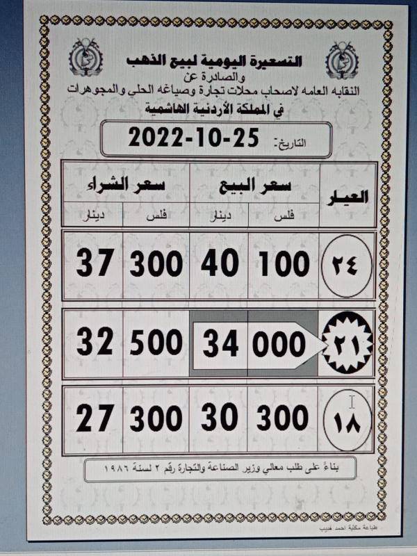 وبلغ سعر غرام الذهب 21 الأكثر رغبة لدى المواطنين عند 34 دينارا للشراء ، و 32.50 دينارا لغاية البيع لمحال الصاغة.