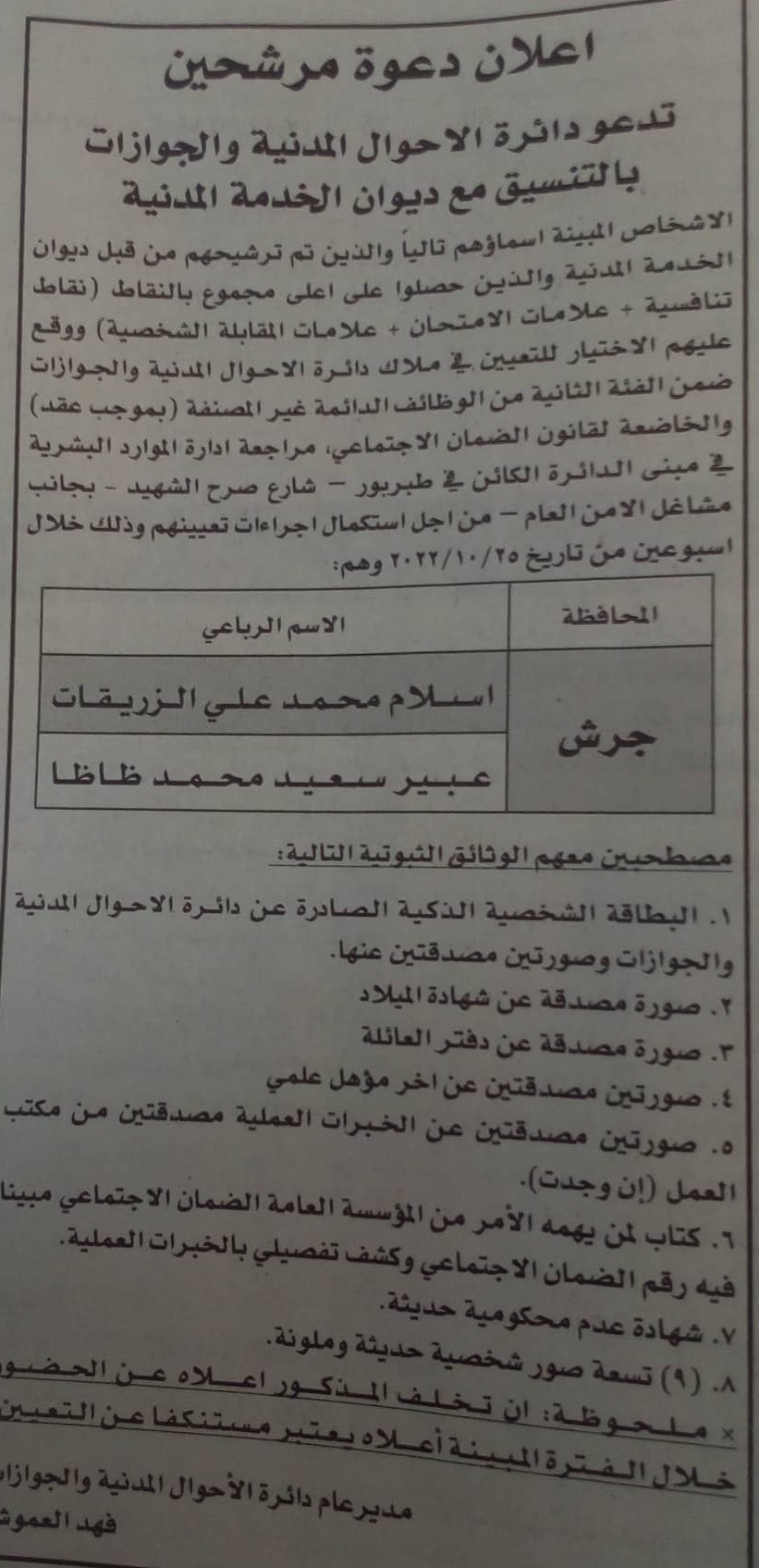 نيروز الإخبارية : دعت دائرة الأحوال المدنية والجوازات بالتنسيق مع ديوان الخدمة المدنية التالي أسماؤهم والذين تم ترشيحهم وحصلوا على أعلى النقاط و وقع عليهم الإختيار من ملاك دائرة الاحوال المدنية والجوازات ضمن الفئة الثانية من الوظائف الدائمة غير المُصنفة مراجعتها لاستكمال إجراءات التعيين.