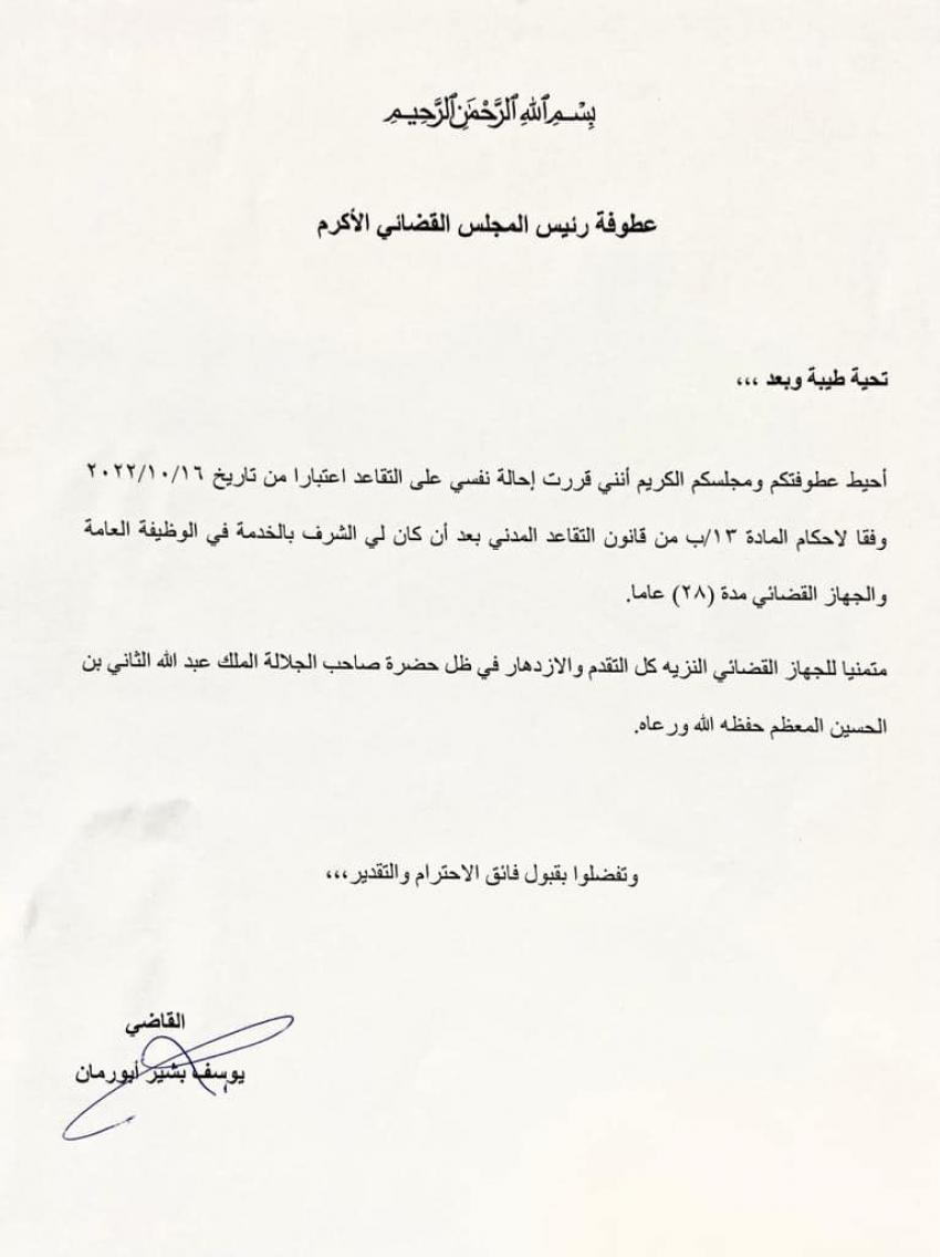 لقد قررت احالة نفسي على التقاعد بعد ان تشرفت بالخدمة بالجهاز القضائي النزية الى ان وصلت الى الدرجه العليا وعملت بجد واجتهاد طيلة ثمانية وعشرين عاما بهدف تحقيق العداله واحقاق الحق في جميع المواقع التي خدمت بها متمنيا لزملائي فرسان الحق دوام التقدم والنجاح ،وسأبقى الجندي المخلص لوطنه وقيادته واهله وعشيرتة ،حامدا الله عز وجل بأنه اصطفانا بقيادتنا الهاشميه وهي وميزانا للعدل والشفافية وصمام امان للوطن بأسره.