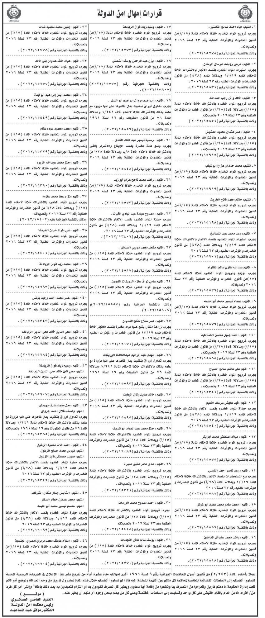 ونشرت المحكمة، أسماء المتهمين، عملا بأحكام المادة 243 /2 من قانون أصول المحاكمات الجزائية رقم 9 لسنة 1961.