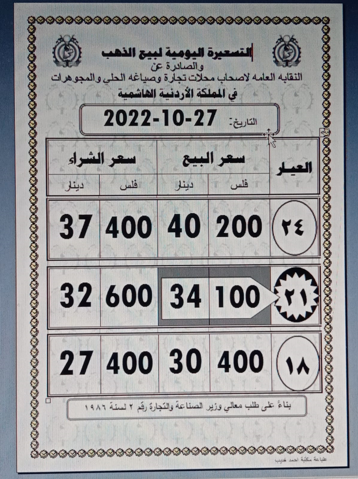 وبلغ سعر الغرام الواحد من عيار 21 ، الأكثر طلبا بين الأردنيين، إلى 34.10 دينارا.