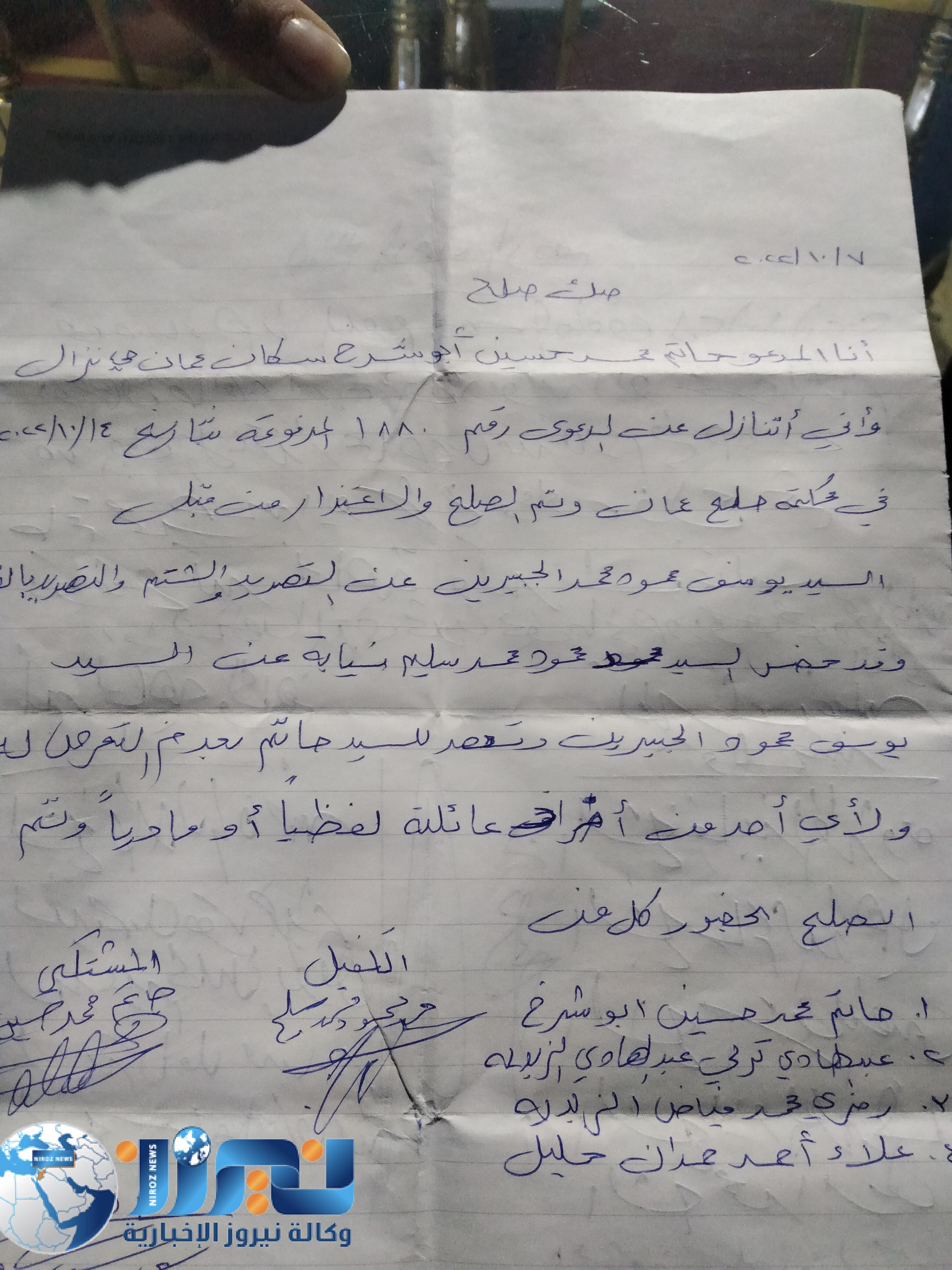 وكان في استقبال الجاهة العشائر الشيخ فايز الظهراوي  وبعد التداول بالحادثة تم التنازل بالاتفاق مع  السيد حاتم محمد حسين ابو شرخ   بالتنازل  في الشكوى التي قدمها ضد السيد يوسف في محكمة صلح  عمان  مشترطًا  بعدم التعرض له ولافراد  عائلته لفظيًا وماليًا حيث أنه تم  بعد ذلك تم توقيع  رئيس الجاهة و رئيس المستقبلين على الوثيقة التعهد التي تم أبرامها بين الطرفين  .