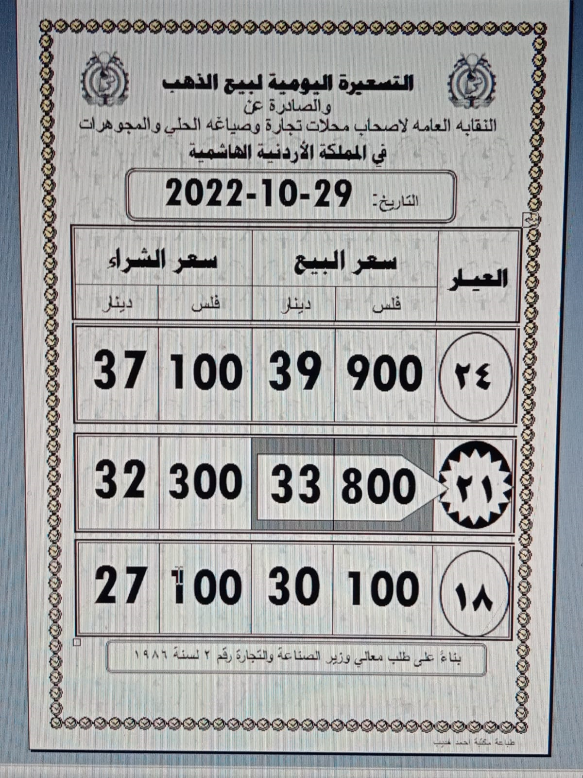 وبلغ سعر الغرام الواحد من عيار 21 ، الأكثر طلبا بين الأردنيين، إلى 33.80 دينارا.