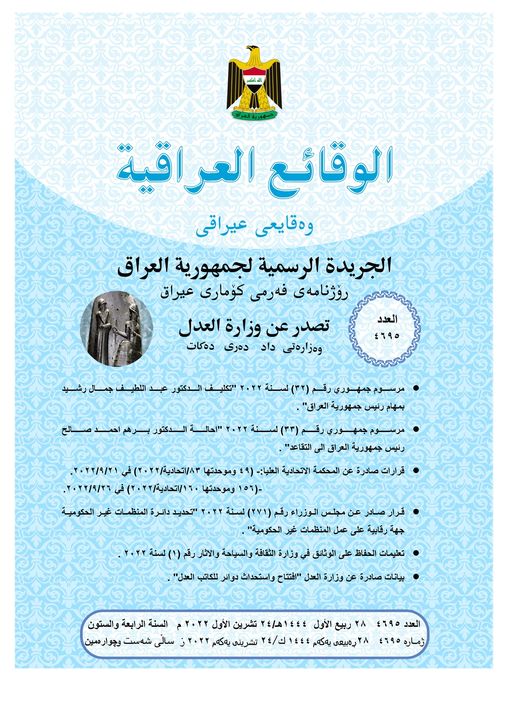 وأضافت المدير العام، أن "العدد تضمن أيضاً صدور قرارات صادرة عن المحكمة الاتحادية العليا المرقمة (49 وموحدتها 83/ اتحادية / 2022 في 21/9/2022) و(156 وموحدتها 160/ اتحادية / 2022 في 26/9/2022)"، مشيرة الى "صدور قرار صادر عن مجلس الوزراء رقم (271) لسنة 2022 تحديد دائرة المنظمات غير الحكومية جهة رقابية على عمل المنظمات غير الحكومية، وتعليمات الحفاظ على الوثائق في وزارة الثقافة والسياحة والاثار رقم (1) لسنة 2022 ، فضلا عن صدور بيانات صادرة عن وزارة العدل افتتاح واستحداث دوائر للكاتب العدل".