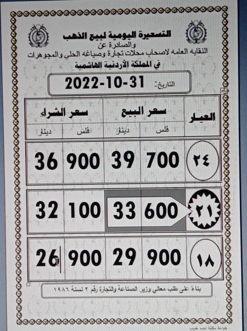 وبلغ سعر شراء الغرام الواحد من عيار 21 ، الأكثر طلبا بين الأردنيين 33.60 دينارا فيما بلغ سعر البيع للصاغة 32.10 دينارا.
