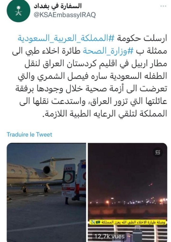 سفارة السعودية في بغداد، أعلنت أن وزارة الصحة بالمملكة أرسلت طائرة إخلاء طبي إلى مطار أربيل في إقليم كردستان العراق، لنقل الطفلة السعودية سارة الشمري.