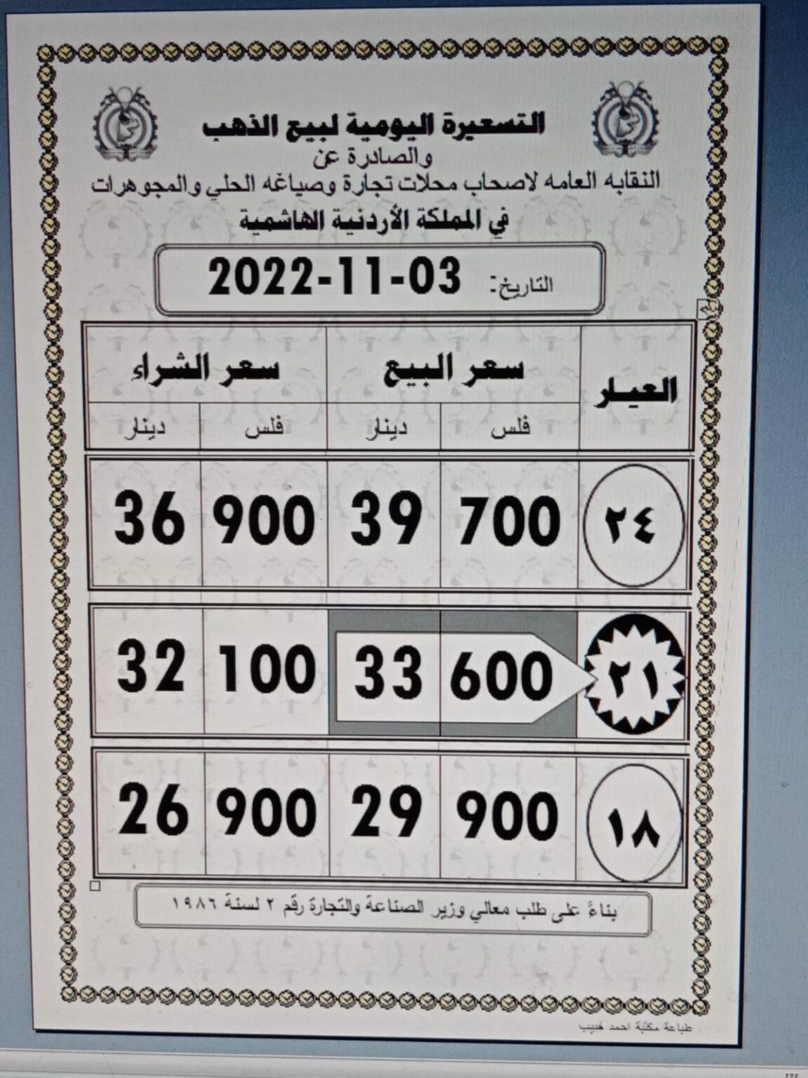 ووفقا للتسعيرة اليومية الصادرة عن النقابة، انخفضت سعر بيع الغرام الواحد من عيار 21 قيراط، الأكثر طلبا بين الأردنيين، إلى 33.60 دينار لغايات شراء المواطنين من محلات الصاغة.