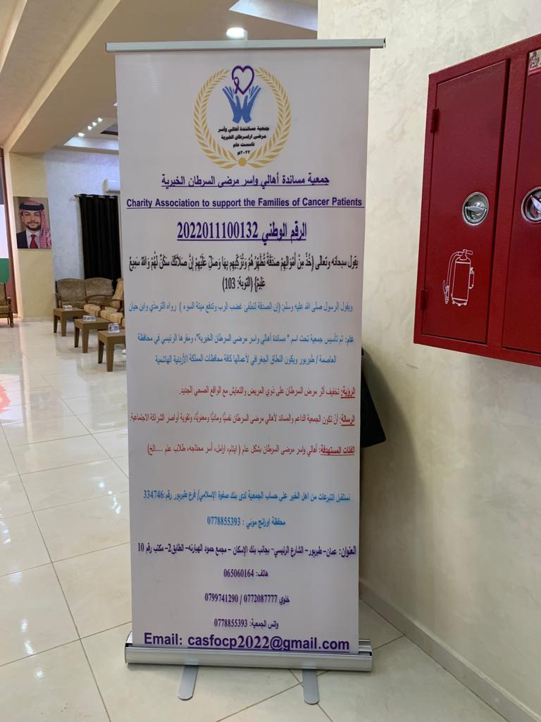 وقال رئيس الجمعيه اللواء الركن المتقاعد عبدالله الحسنات أن اهداف الجمعية واستعدادها تقوم على الدعم النفسي والمعنوي والمادي لاهالي مرضى السرطان في المملكه بشكل عام  .