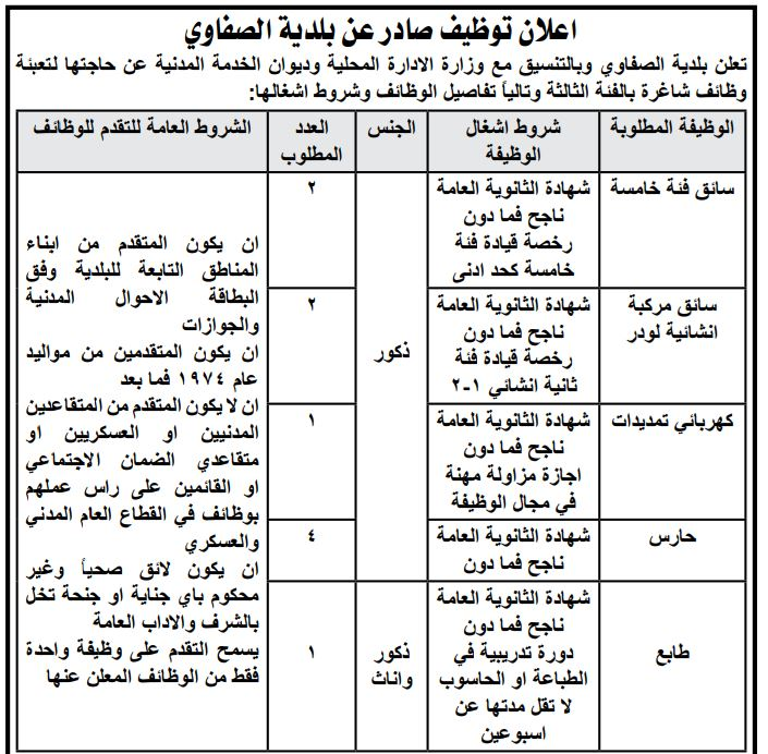 وظائف شاغرة في بلدية الصفاوي