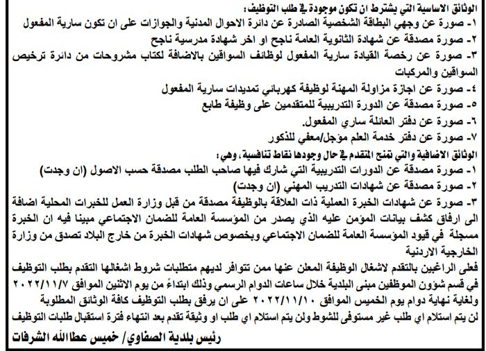وبينت البلدية في إعلانها أن الوظائف المطلوبة هي ( سائق فئة خامسة، سائق مركبة انشائية، كهربائي تمديدات، حارس، طابع).
