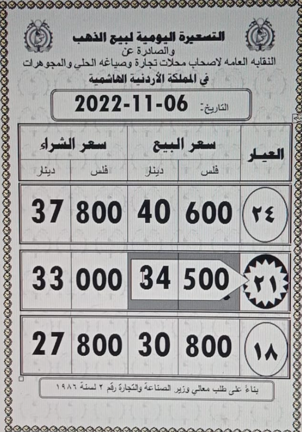 وبلغ سعر بيع غرام الذهب عيار 21 الأكثر رغبة من الأردنيين بالسوق المحلية عند 34.50 دينارا لغايات شراء المواطنين من محلات الصاغة.