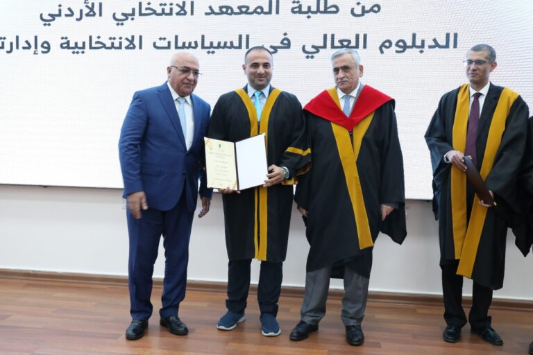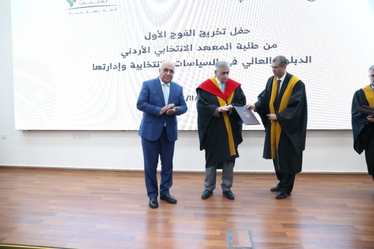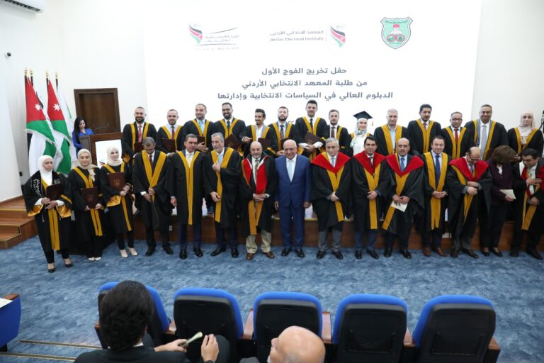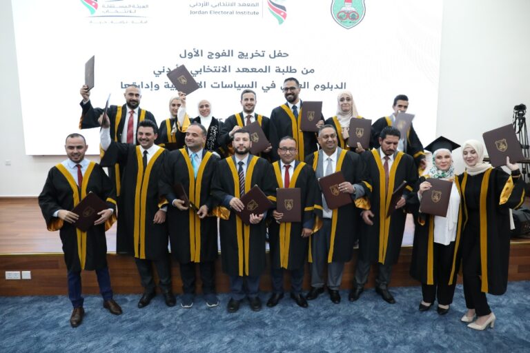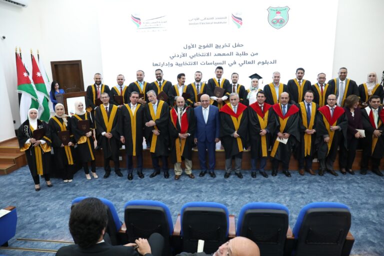 احتفلت الهيئة المستقلة للانتخاب اليوم بتخريج الفوج الأول من طلبة الدبلوم العالي في السياسات الانتخابية وادارتها، من المعهد الانتخابي الأردني، وذلك بحضور رئيس مجلس مفوضي الهيئة المستقلة للانتخاب، المهندس موسى المعايطة ورئيس الجامعة الأردنية الأستاذ الدكتور نذير عبيدات.