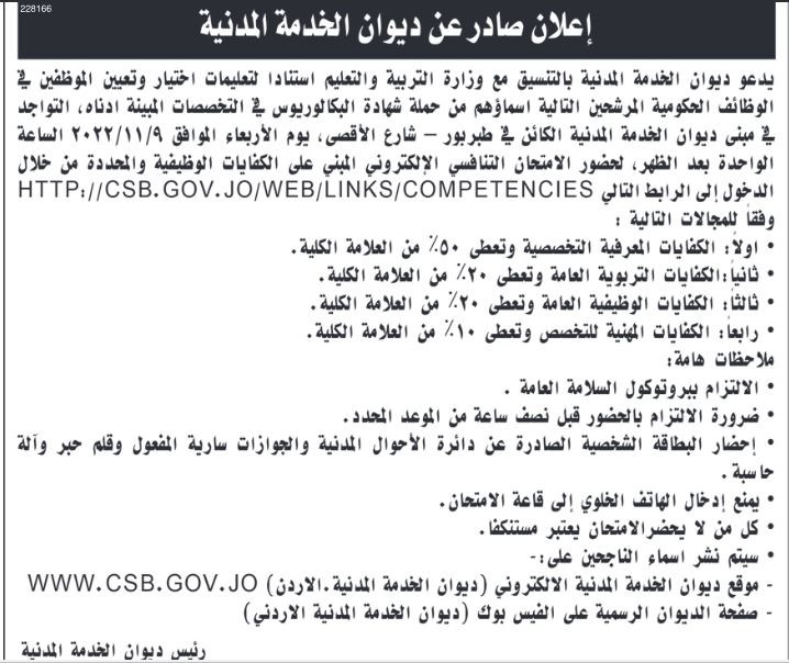 نيروز الإخبارية : دعا ديوان الخدمة المدنية بالتنسيق مع وزارة التربية والتعليم المرشحين من حملة شهادة البكالوريوس، إلى حضور الامتحان التنافسي الإلكتروني.