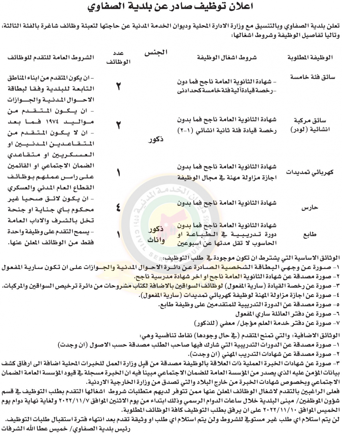 أعلنت بلدية الصفاوي وبالتنسيق مع ديوان الخدمة المدنية حاجتها لتعبئة وظائف شاغرة بالفئة الثالثة وذلك وفقًا للاعلان التالي :