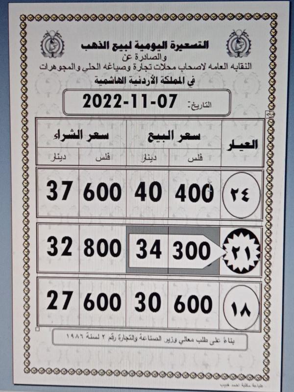 وبلغ سعر بيع غرام الذهب عيار 21 الأكثر رغبة من الأردنيين بالسوق المحلية عند 34,30 دينارا لغايات شراء المواطنين من محلات الصاغة مقابل 32.80 لغايات البيع.
