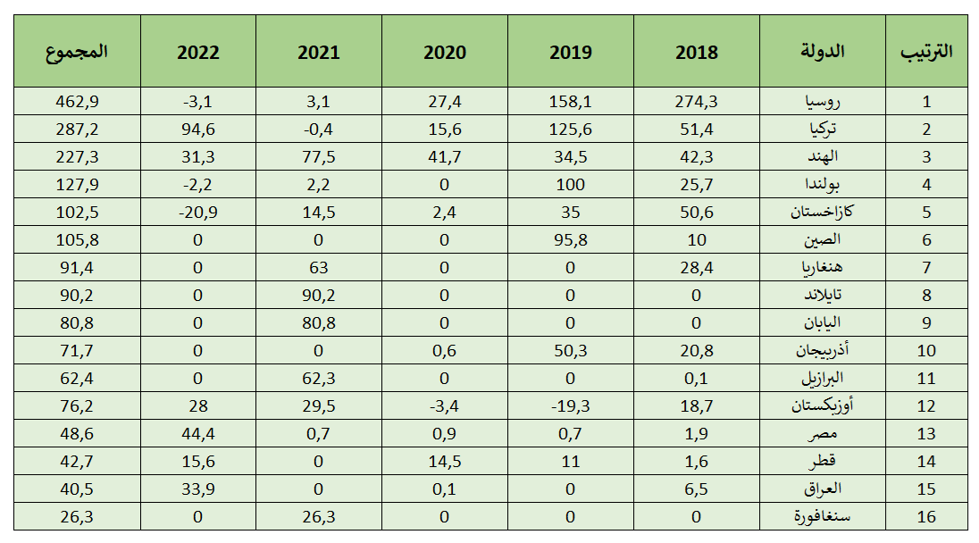 وضمت القائمة 3 دول عربية وهي: مصر (48.6 طن) وقطر (42.7 طن) والعراق (40.5 طن).