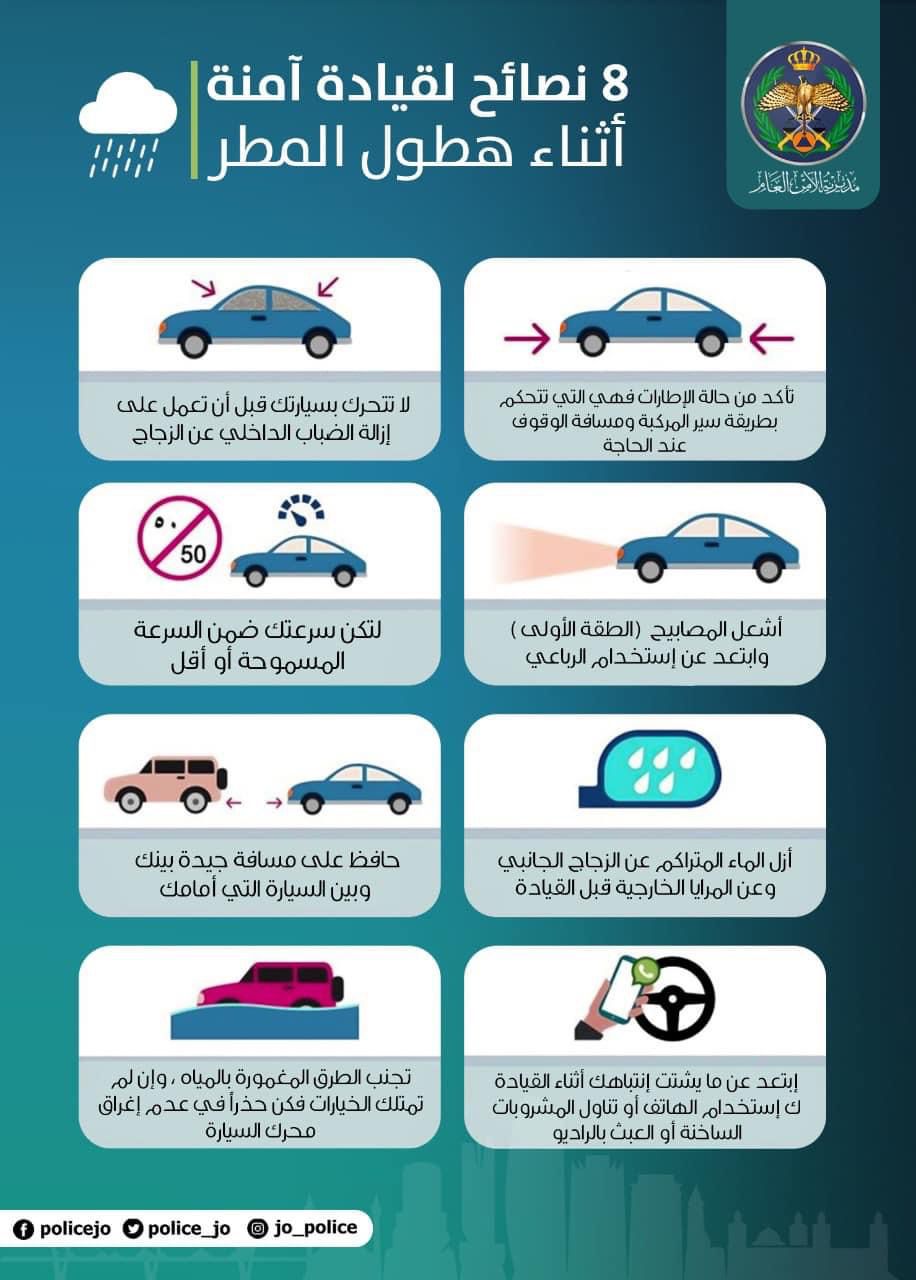 واشارت الادارة في ادراج لها عبر الفيسبوك الثلاثاء، الى عدة ملاحظات من أجل قياده آمنة لتلافي الأخطار أثناء هطول الامطار، حيث دعت الى التأكد من الصلاحية الفنية للمركبة والتزم بالسرعة بما يتناسب مع حالة الطريق وترك مسافة آمنة عن باقي المركبات والحافظ على رؤية واضحة.