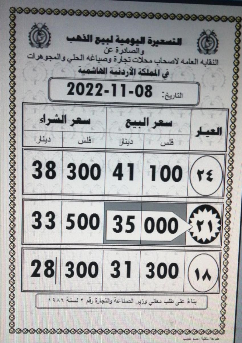 وبلغ سعر غرام الذهب عيار 21 الأكثر رغبة لدى المواطنين 35 دينارا، لجهة الشراء من المحلات مقابل 33،50 دينارا لجهة البيع.