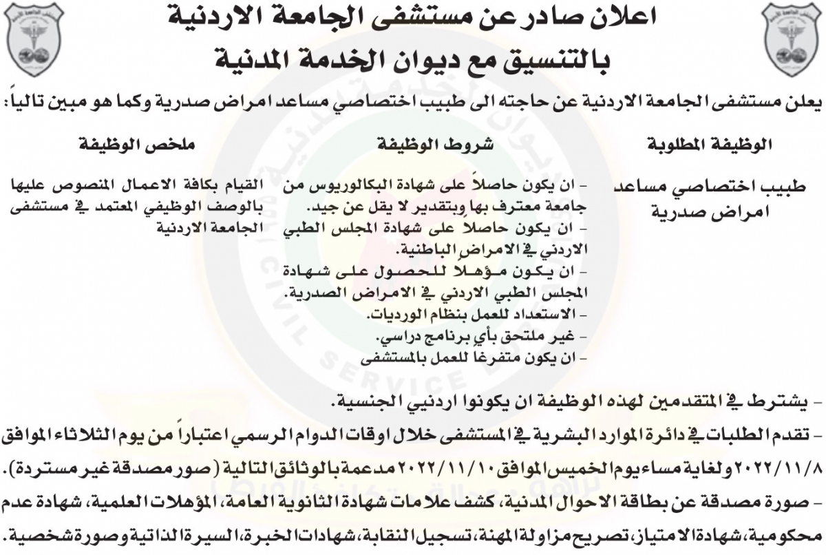 أعلن مستشفى الجامعة الأردنية حاجته لطبيب اختصاصي مساعد امراض صدرية وفق الإعلان التالي :