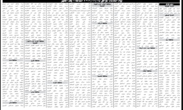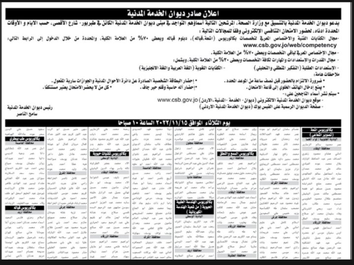 دعا ديوان الخدمة المدنية بالتنسيق مع وزارة الصحة التالية أسماؤهم لحضور الامتحان التنافسي، حسب الأيام والأوقات المحددة أدناه؛ لغايات التعيين في الصحة