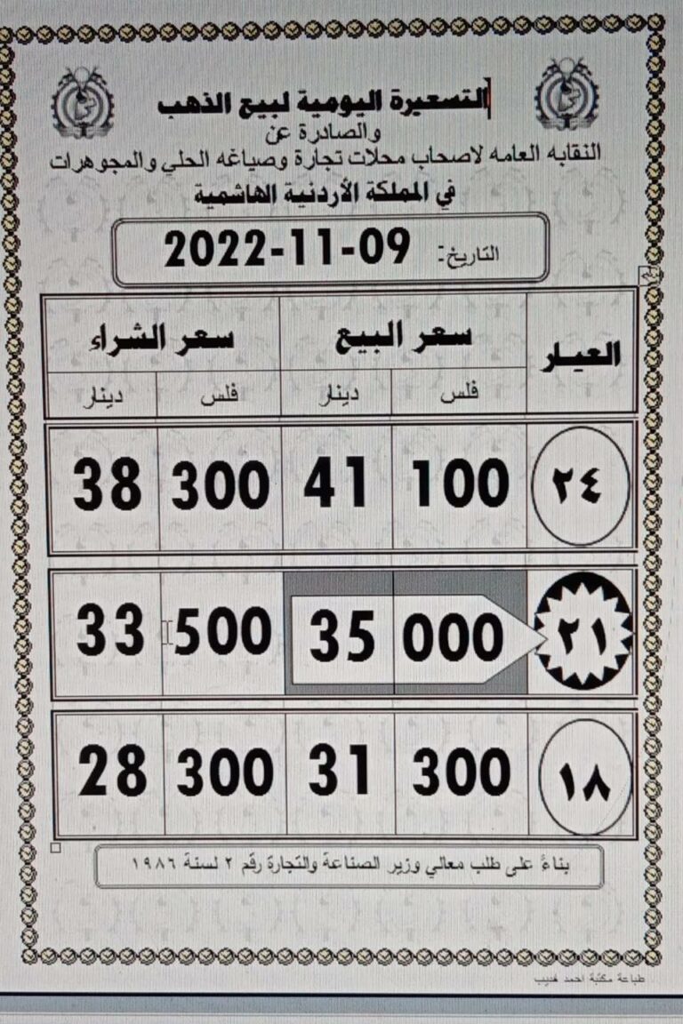ووفقا للتسعيرة اليومية الصادرة عن النقابة، انخفضت سعر بيع الغرام الواحد من عيار 21 قيراط، الأكثر طلبا بين الأردنيين، إلى 35,00 ديناراً لغايات شراء المواطنين من محلات الصاغة مقابل 33,50 ديناراً البيع.