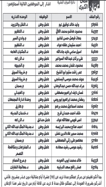 : أنذرت أمانة عمان الكبرى، اليوم الأحد، 20 عامل وطن وعامل حدائق آخر، بالعودة الى عملهم خلال 3 أيام ، والا سيتم فصلهم نتيجة تغيبهم عن العمل لمدة تزيد عن 10 أيام.