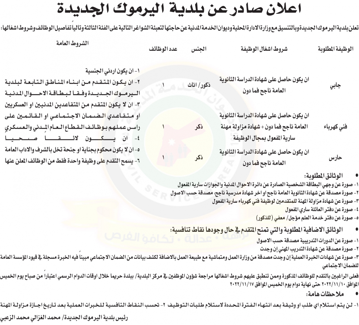أعلنت بلدية اليرموك الجديدة وبالتنسيق مع وزارة الإدارة المحلية وديوان الخدمة المدنية حاجتها لتعبئة وظائف شاغرة بالفئة الثالثة وذلك وفقًا للاعلان التالي :