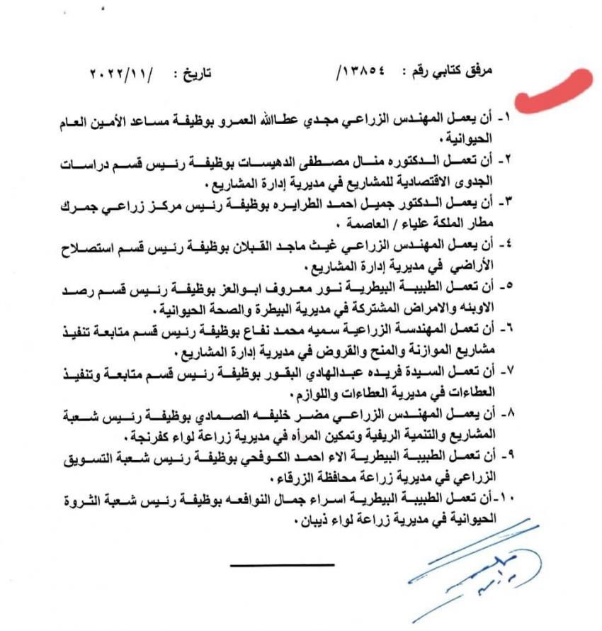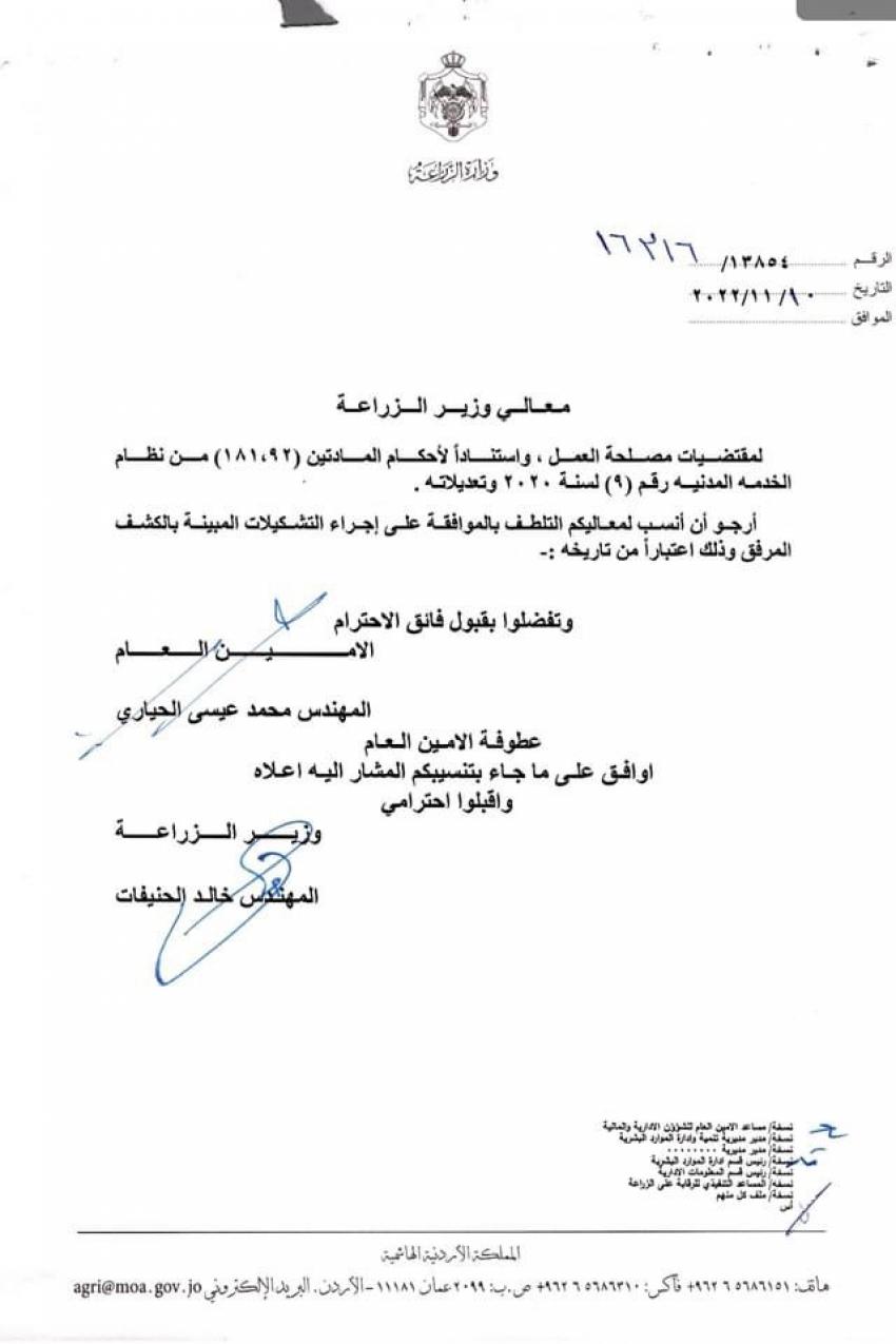 قرر وزير الزراعة المهندس خالد الحنيفات اجراء تشكيلات إدارية في مديريات الوزارة.