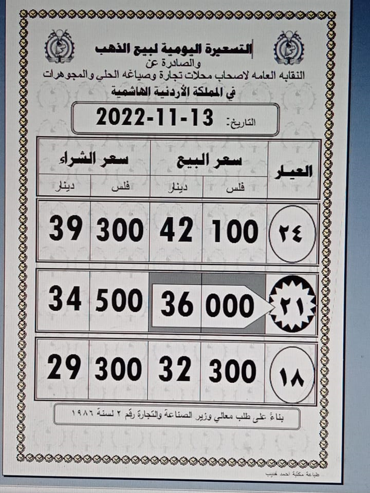 نيروز الإخبارية : بلغ سعر غرام الذهب عيار 21 الأكثر طلبا في السوق المحلية، اليوم الأحد، 36.00 دينارا لجهة الشراء من المحلات، مقابل 34.50 لجهة البيع، وفق النقابة العامة لأصحاب محلات بيع وصياغة الحلي والمجوهرات.