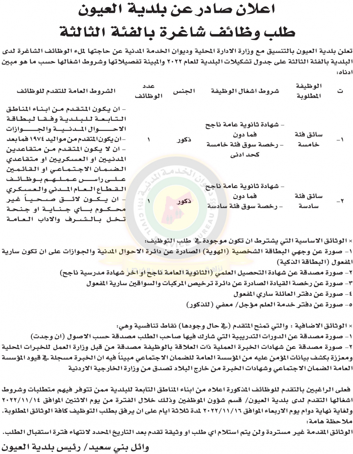 أعلنت بلدية العون بالتنسيق مع وزارة الإدارة المحلية وديوان الخدمة المدنية حاجتها لملء وظائف شاغرة لديها بالفئة الثالثة وذلك وفق الإعلان التالي:
