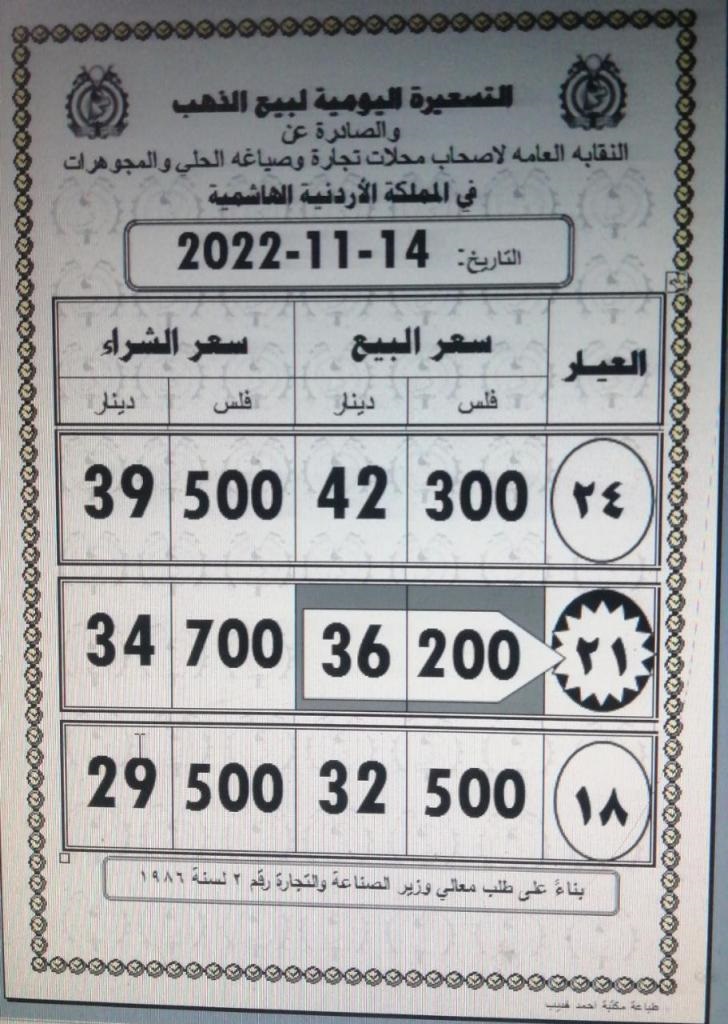 وبحسب التسعيرة الثالثة الصادرة عن النقابة العامة لأصحاب محلات بيع وصياغة الحلي والمجوهرات، ارتفع سعر بيع الذهب عيار 21 الأكثر طلبا بين الأردنيين إلى 36.20 دينار للغرام الواحد -البيع-، مقابل 34.70 دينار للشراء.
